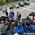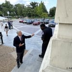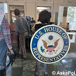 SCENE: Ask a Pol’s Matt Laslo waits in back of Sen. Tim Kaine as he finishes answering a few reporters’ questions in the Senate basement.